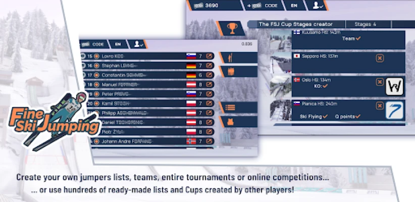 Fine Ski Jumping nudi nebrojene načine da testirate svoje veštine. Uključite se u raznovrsne modove kao što su Svetski kup, 4H turneja sa KO sistemom, Planica7 i mnogi drugi, takmičeći se individualno ili vodeći svoj tim do pobede. Želite da izazovete prijatelje? Kreirajte sopstvena onlajn takmičenja, birajte skakaonice, uslove vetra i broj rundi, stvarajući jedinstvena iskustva. Ali to nije sve – sa inovativnim Kreatorom skakaonica, granice su vaša mašta. Dizajnirajte idealnu stazu za letenje i isprobajte je sami ili je podelite sa svetskom zajednicom, bilo van mreže ili u onlajn okruženju.