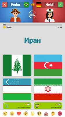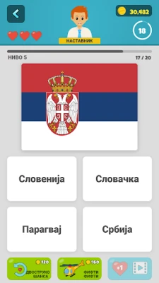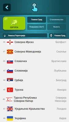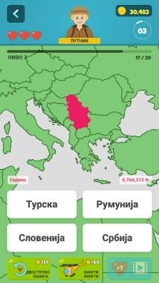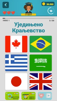 Надоградите своју стратегију и прилагодите своје искуство. Зарадите злато и бодове у мултиплејер мечевима, које можете потрошити на корисне помоћне линије, нове аватаре, теме или узбудљиве изазовне режиме. Искористите предности помоћних линија попут "50:50 шансе" или "двоструке шансе за одговор" да бисте преокренули ток игре у своју корист. Поред тога, наша интерактивна мапа света је непроцењив алат за самостално учење географије, омогућавајући вам да истражујете локације и облике свих земаља. Сваки ниво је обогаћен функционалним картицама које вам омогућавају да дубински проучите заставе, називе земаља, главне градове, популације, површине или валуте.